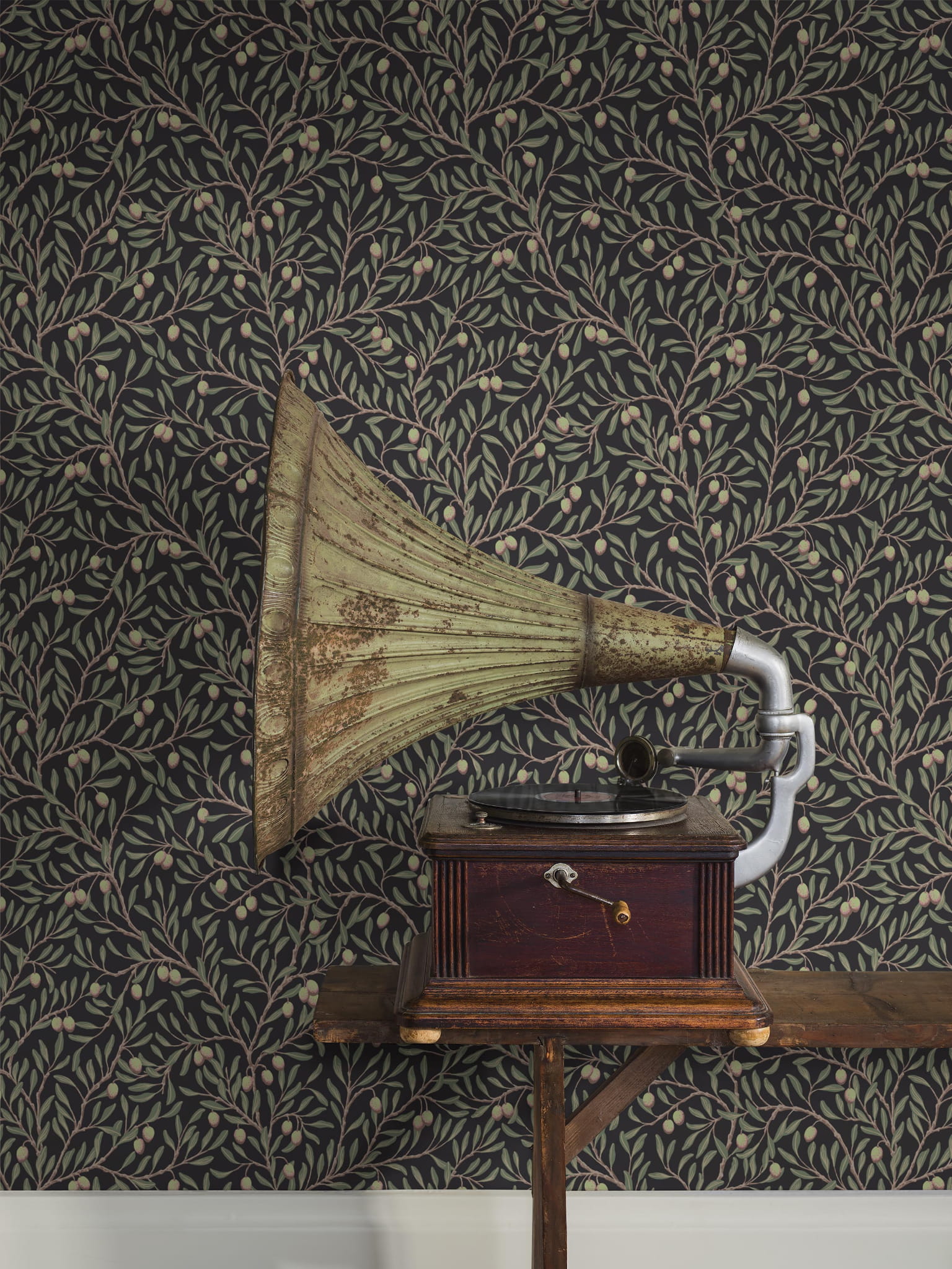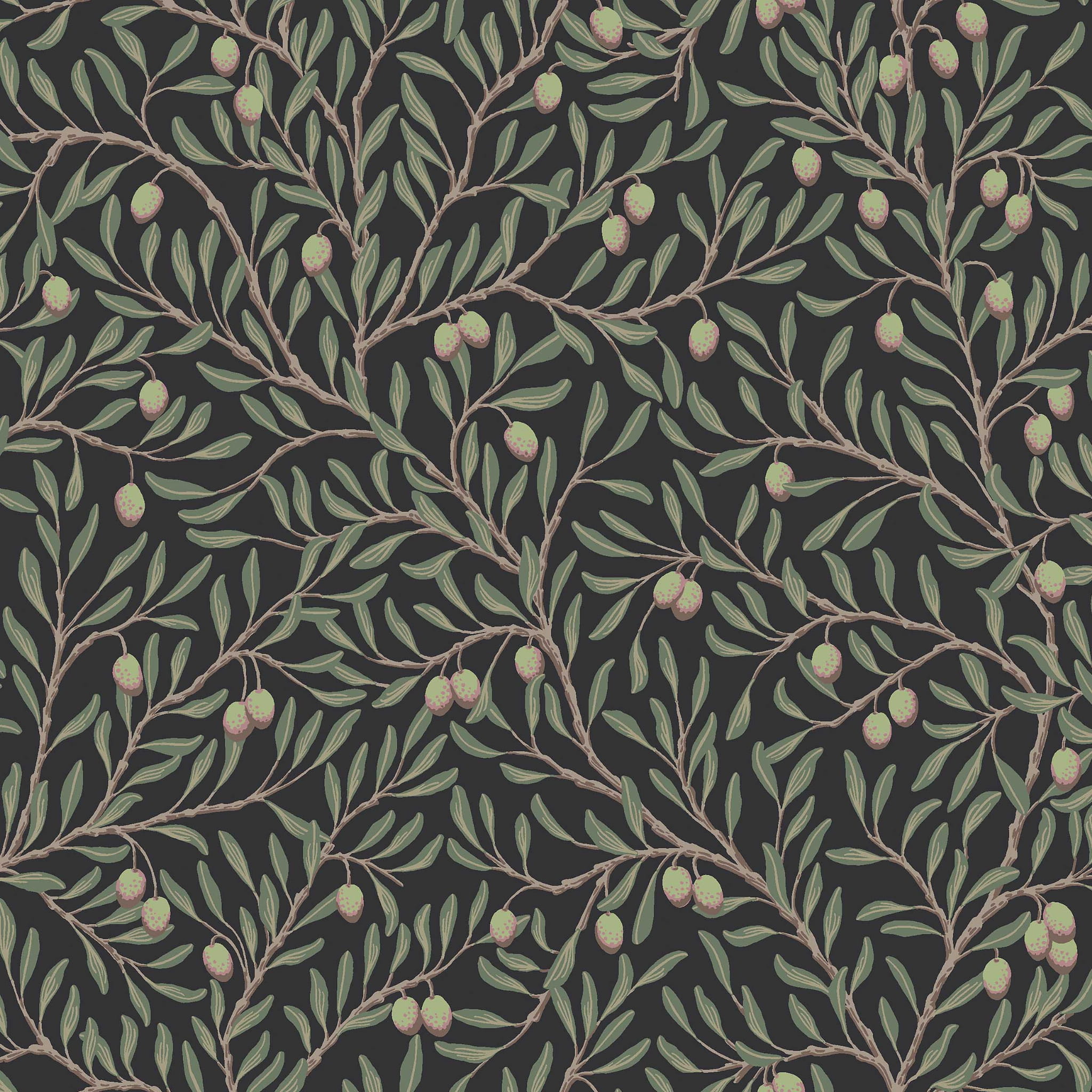 5704 BorasTapeter Orangeri tapeta vintage czarna w gałązki oliwne, zielone oliwki