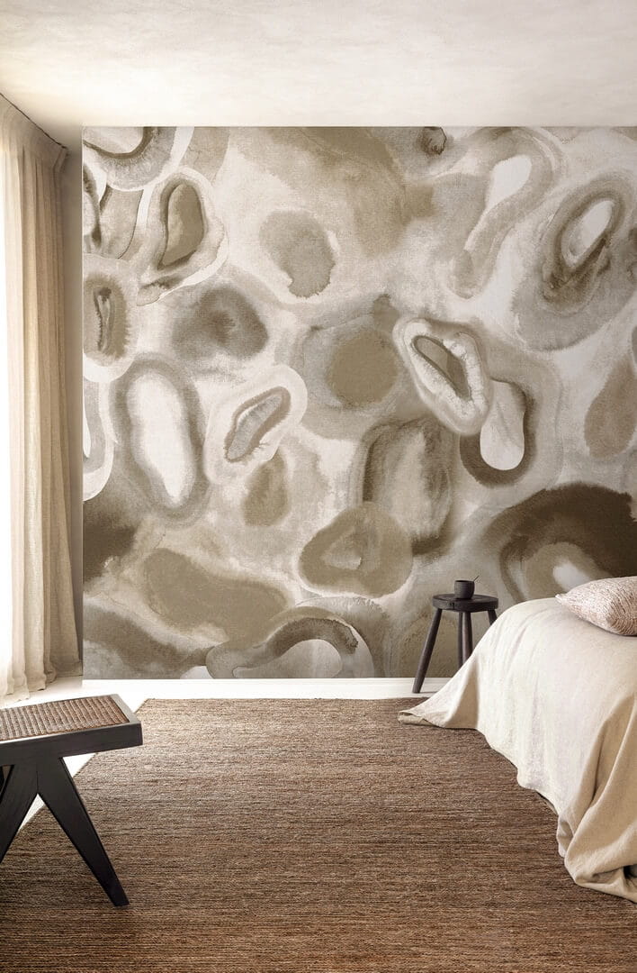 Ten mural przyciąga spokojem, jakby zatrzymywał w kadrze subtelny ruch materii. Miękkie, organiczne kształty układają się w kompozycję przypominającą artystyczny zapis procesu: przenikania, rozmycia i delikatnej erozji. Wzór ma w sobie efekt malarski, dzięki czemu ściana zyskuje wrażenie głębi i ręcznie tworzonej pracy. Abstrakcja jest tu wyważona i harmonijna, dlatego nie dominuje wnętrza, lecz nadaje mu wyrafinowany charakter. To propozycja dla osób, które szukają dekoracji z klasą, o spokojnej energii i wyczuwalnej, naturalnej inspiracji. Całość prezentuje się jak współczesny obraz, który buduje nastrój bez potrzeby dosłowności.