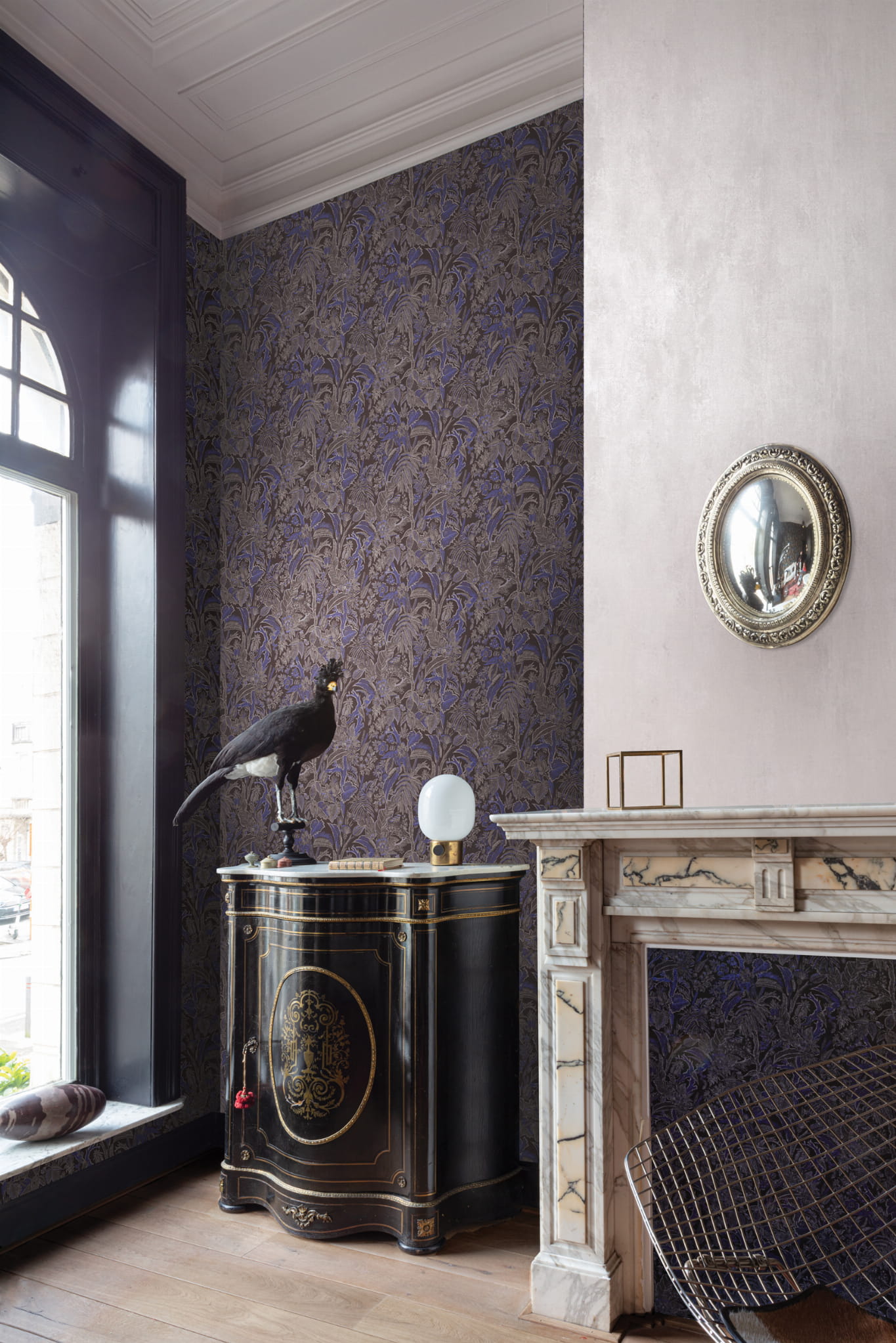 Onikar to piękny projekt na całej powierzchni z rysunkami małych liści i kwiatów, dostępny w kolorze niebieskim lub zielonym na czarnym tle lub białym na musztardowym, srebrnym, beżowym lub szaroniebieskim tle.